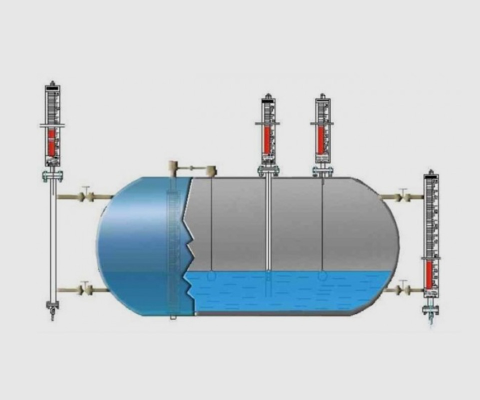 液位計根據(jù)浮力原理,浮子在測量管內隨液位的升降而上下移動,浮子內的永久磁鋼通過磁合作用,驅動紅、白色翻柱翻轉180液位上升時,翻柱由白色轉為紅色,下降時,翻柱由紅色轉為白色,從而實現(xiàn)液位的指示。